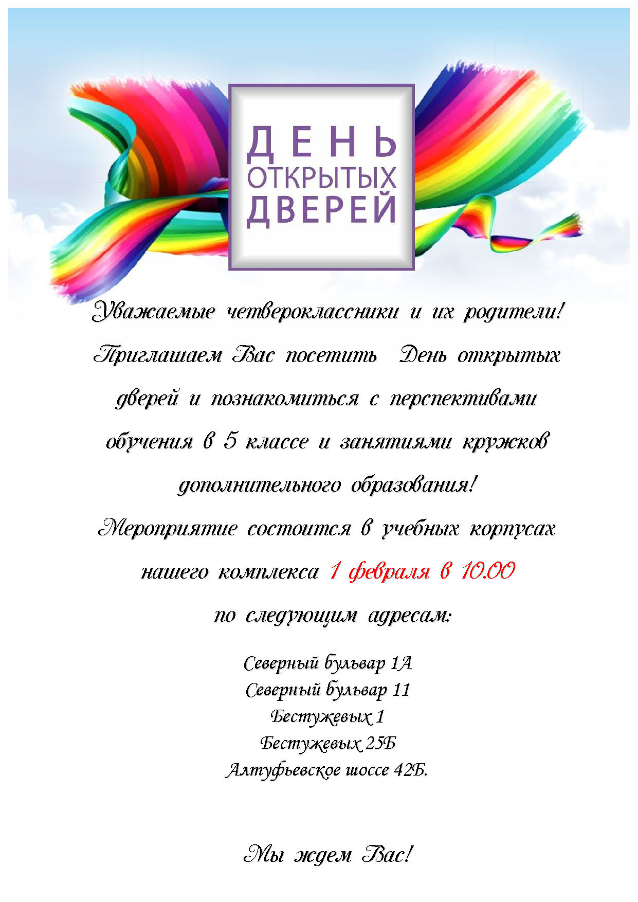Обучающихся 4-х классов и их родителей приглашаем 1 февраля в 10.00 на День открытых дверей